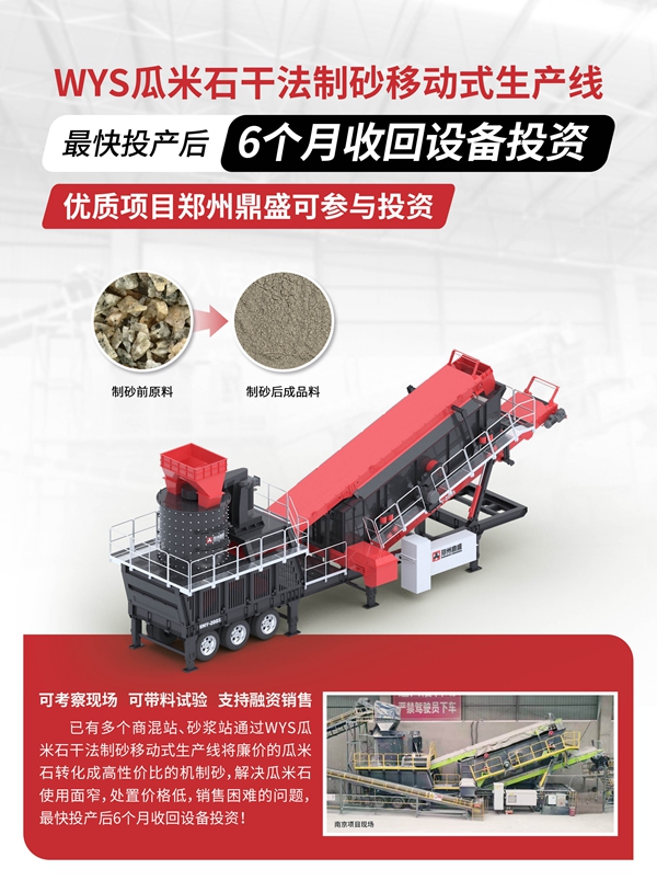 WYS瓜米石干法制砂移动式生产线:专门针对瓜米石等低动能、低产率、磨损较大的小骨料制砂研发,将给料料仓、带式定量给料机、制砂筛分轮胎移动站等设备通过合理的工艺优化组合,将廉价瓜米石成功转化为优质机制砂,具有超快收回投资、超低电耗、超便捷转场等显著优势,成品机配合理,细度模数可调,符合国家《建筑用砂》、《建筑用卵石、碎石》标准。