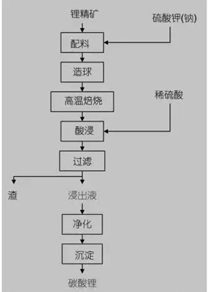 硫酸法处理锂矿石需要预先将锂矿石高温焙烧,使其结构由致密变为疏松,再经球磨后与过量硫酸混合,在回转炉中250℃下焙烧溶解,水浸后得粗硫酸锂溶液,经净化、沉锂、蒸发浓缩后获得碳酸锂产品。