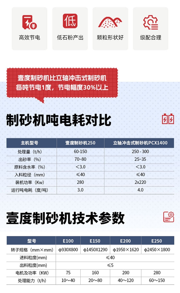 壹度制砂机与“石打石”冲击式制砂机相比,节电可达30%,且出砂成品质量优良,符合国标二区标准。
