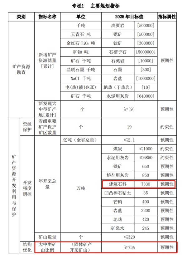 2025 年全省矿产开采总量预期在 2.1 亿吨以内,矿山数量预期在 320 个以内。加强各市矿山总数和年开采总量的科学调控, 促进矿产资源的节约集约利用,保障经济社会发展的资源需求。重点调控10个主要开采矿种(见专栏 1),其中煤炭、水泥用灰岩等 2 个矿种年开采总量为约束性指标,2025年开采总量控制在7850万吨以内。熔剂用灰岩、铁矿、建筑石料、岩盐、芒硝、 凹凸棒石粘土、地热、矿泉水等 8 个矿种年开采总量为预期性指标,2025 年开采总量预期约1.21亿吨左右。