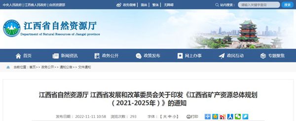 日前,江西省自然资源厅、发改委印发《江西省矿产资源总体规划(2021-2025年)》(下附全文),提出至2025年,江西战略性与优势矿产实现新的找矿突破,资源保障能力不断增强。矿业开发布局与结构进一步优化,矿产资源开发利用水平明显提升,矿业产业集群进一步壮大。