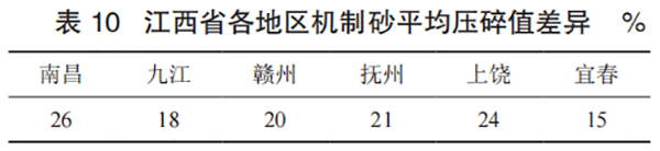 (5)江西省内机制砂平均压碎值为 21%,符合国家标准 GB/T 14684—2011《建设用砂》中砂的单级最大压碎值指标不得高于 30% 的要求。南昌地区机制砂单级最大压碎值指标平均值为 26%,为省内最高。宜春地区机制砂单级最大压碎值指标平均值为 15%,为省内最低。