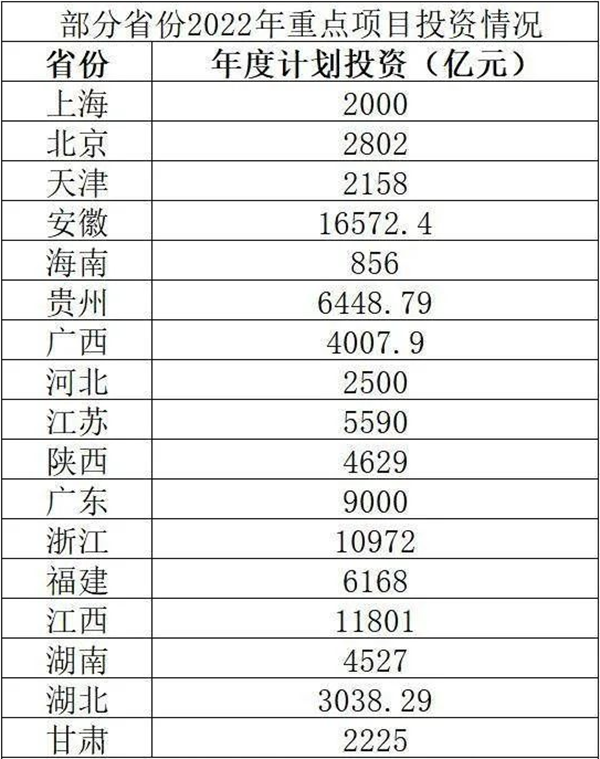 截至目前,全国已有19个省市区公布了2022年重点项目投资计划清单,包括北京、上海、天津、广东、江苏、浙江、四川、贵州、河北、安徽等。其中,安徽、江西、浙江三省年度计划投资均超万亿元。